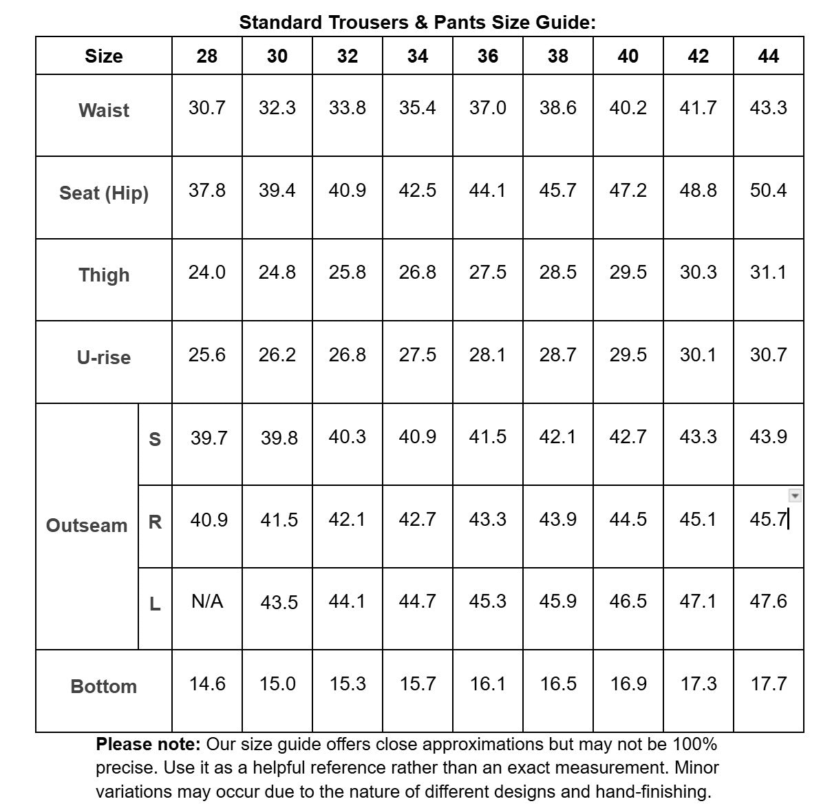 Each product page includes a size guide image showing approximate measurements of the final garment. These numbers are not exact, as different designs, materials, and handcrafting can cause slight variations.