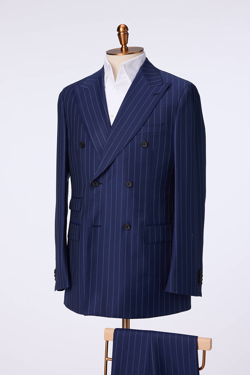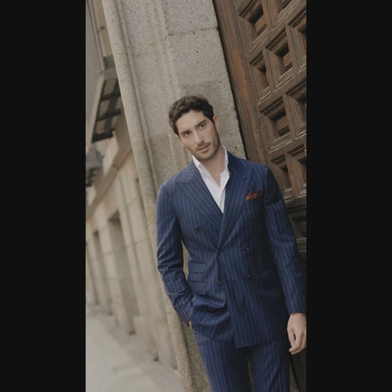 The jacket of this commanding suit features distinguished peak lapels that broaden the silhouette, perfectly framing its iconic double-breasted front. It boasts a functional yet stylish ticket pocket, a subtle nod to classic tailoring traditions. The sleeves are finished with four kissing buttons, a hallmark of quality and custom craftsmanship. Designed for comfort and fluid movement, the jacket incorporates practical side vents in the rear, ensuring a clean drape and ease of wear. The navy pinstripe pattern on the premium wool fabric offers a refined texture and a sleek, elongating effect, emphasizing your confident presence.