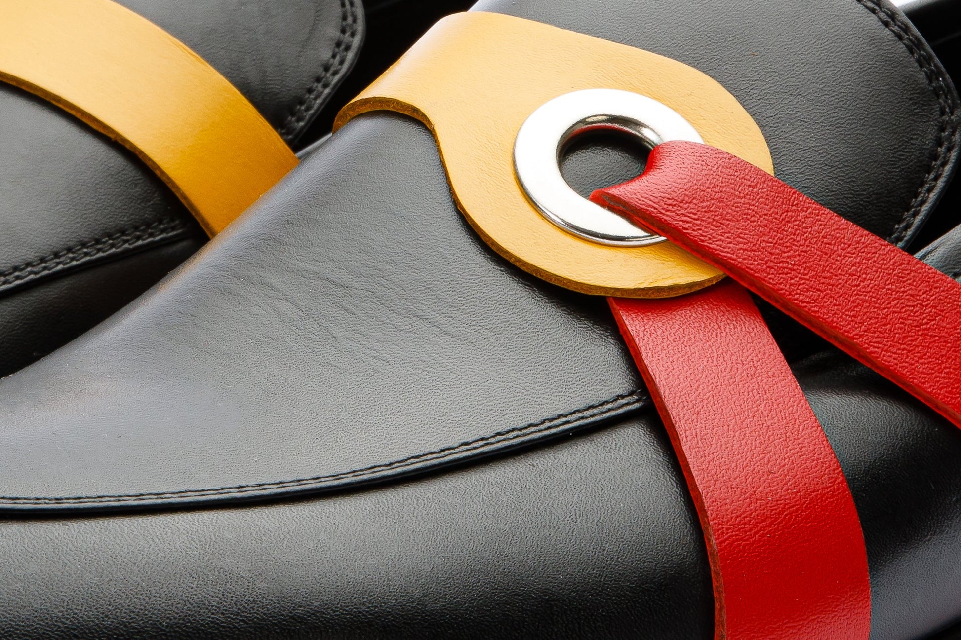 The defining feature is the silver ring on the upper, adorned with two belts—one in vibrant yellow and the other in rich red—creating a dynamic and eye-catching detail. This unique embellishment adds a touch of individuality and modernity to the enduring design of the bit loafer.