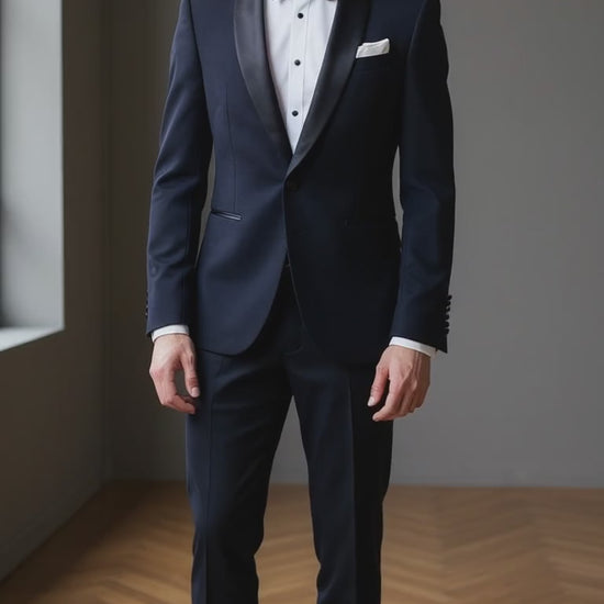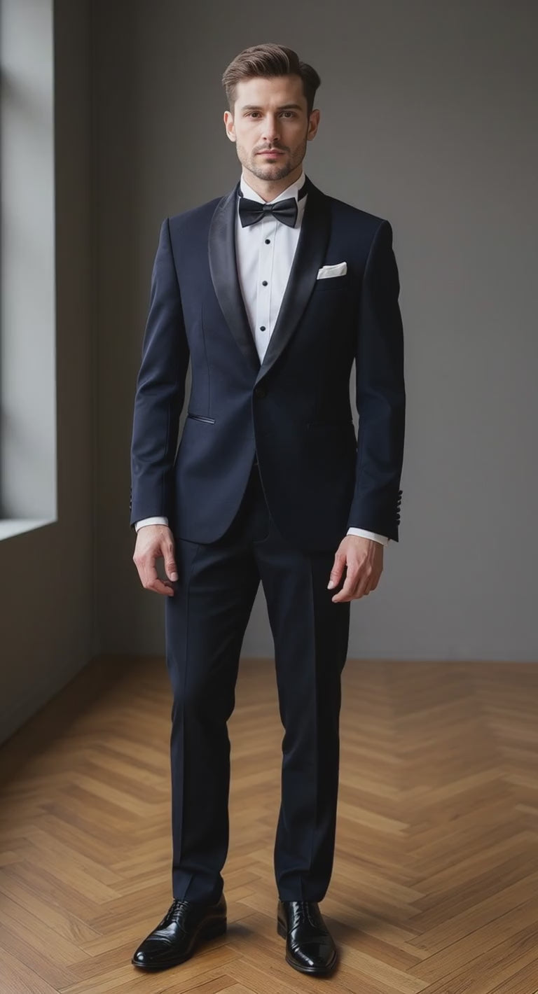 The distinguished black satin shawl lapel creates a commanding contrast against the rich navy canvas, striking that perfect balance between timeless tradition and contemporary elegance. Every element has been considered with the discerning connoisseur in mind—from the hand-finished satin-covered buttons to the precisely tailored trousers adorned with a subtle black satin stripe that extends the eye and ensures a silhouette of exceptional proportion.