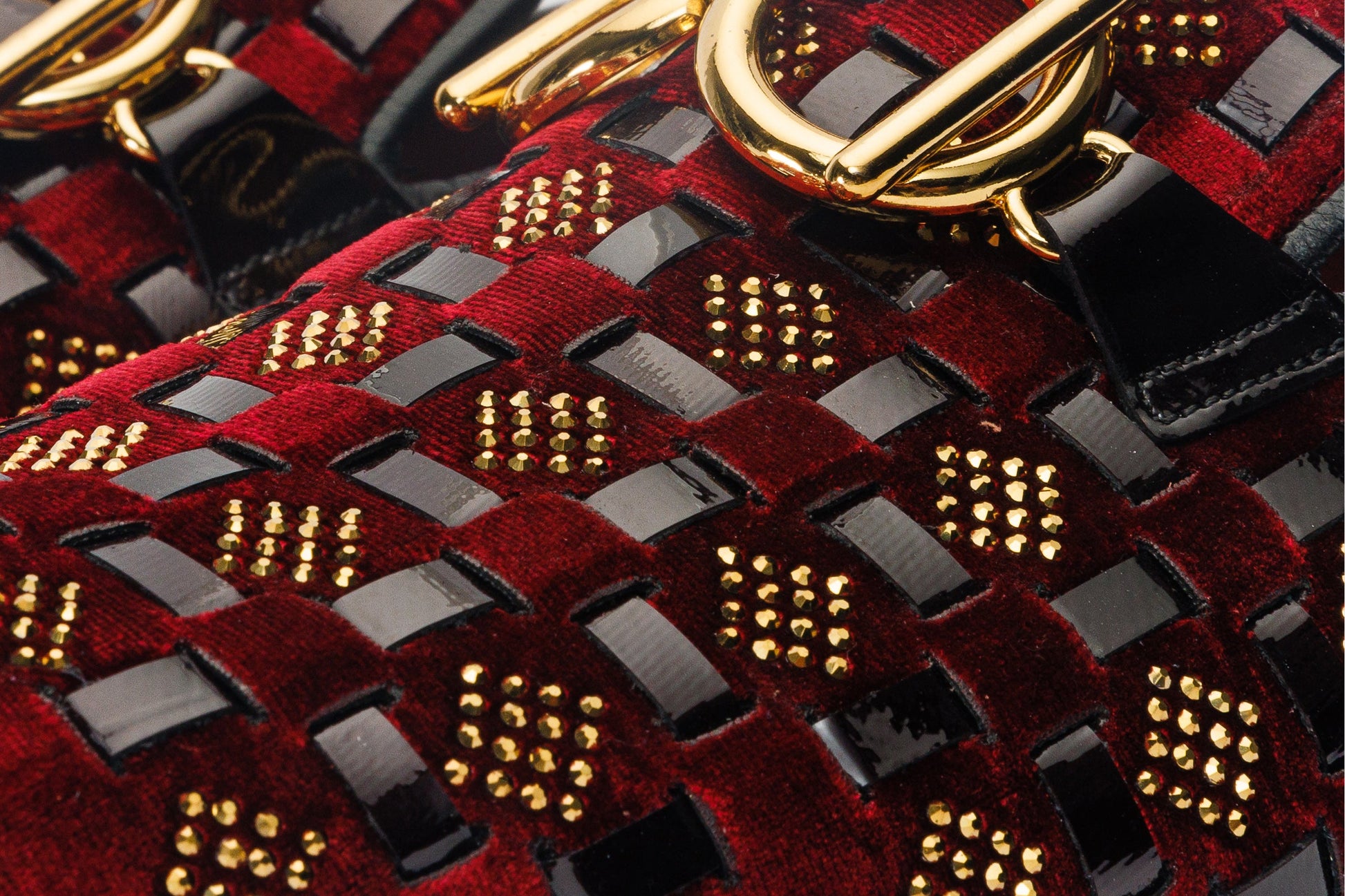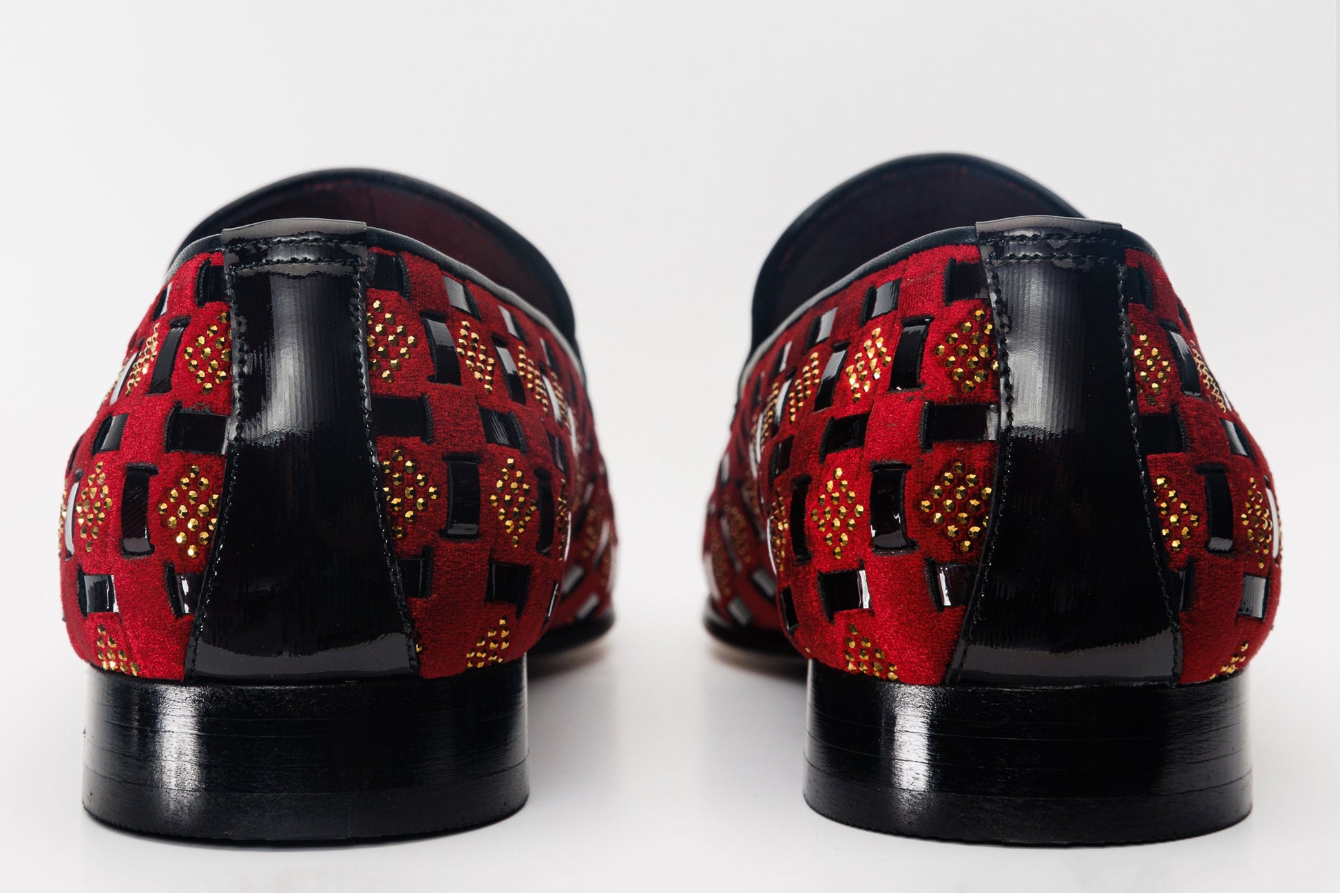 The exterior is a masterpiece of design, showcasing a meticulous blend of patent and suede leather, hand-woven to perfection. Adorning the shoe are carefully placed handcrafted gold-tone stones, adding a touch of opulence and individuality to this unique piece.